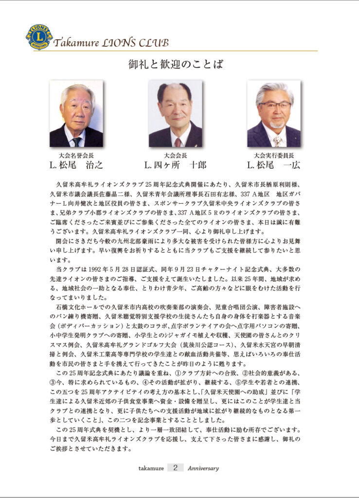 - 式典名 : 久留米高牟礼ライオンズクラブ 結成25周年記念式典