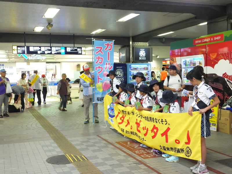 ボーイスカウト・ガールスカウトによる募金活動と、久留米地区7ライオンズクラブを始め各団体が集まり、リーフレットやティッシュ等を配布して、麻薬・覚せい剤等の薬物乱用防止を街頭キャンペーンしました。